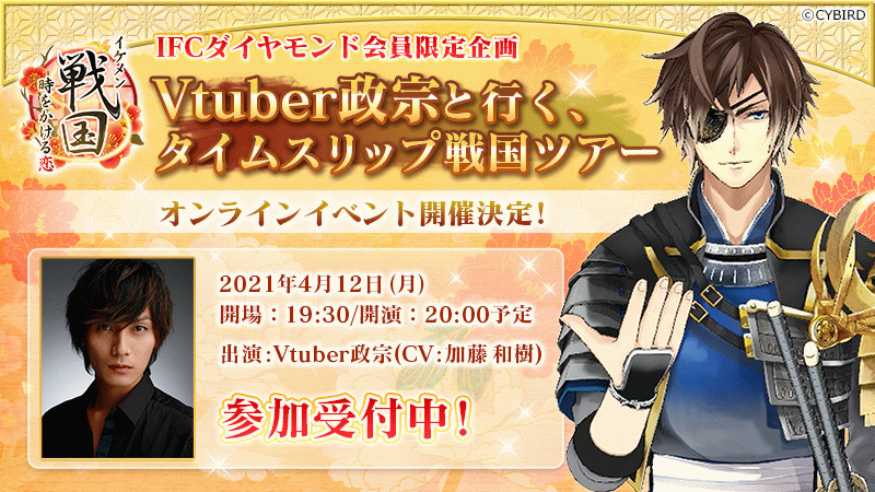 この度イケメンシリーズファンクラブ開設1周年を記念して、ダイヤモンド会員限定オンラインイベント「Vtuber政宗と行く、タイムスリップ戦国ツアー」を開催することとなりました。