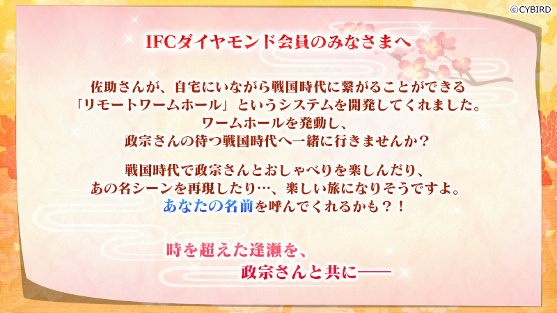 イベントは二部構成となっており、ダイヤモンド会員であれば全員参加できる「タイムスリップ戦国ツアー」と、抽選で「伊達政宗」と二人きりのおしゃべりが楽しめるチャンス企画、「政宗と2ショットトーク(仮)」など、「伊達政宗」とたくさんコミュニケーションをとれる豪華企画を多数ご用意しています。