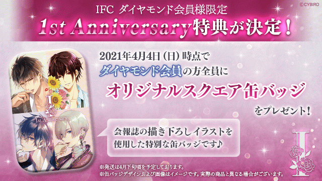 IFC NEWS 2021.04.21 【IFC】ダイヤモンド会員限定1stAnniversary特典が決定! イケメンシリーズファンクラブ(IFC)の1周年を記念した 1stAnniversary特典が決定いたしました! 会報誌の描き下ろしイラストを使用した ファンクラブ限定のオリジナルスクエア缶バッジです♪ 発送は4月下旬頃を予定しております。 お届けまで今しばらくおまちください。 ※特典は2021年4月4日(日)時点でダイヤモンド会員の方全員が対象となります。 お知らせ一覧へ