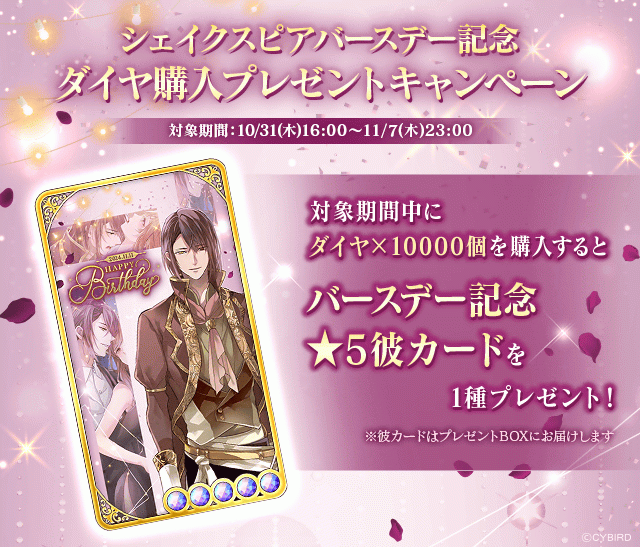 イケシリマーケットで「ダイヤ×10,000個+1,000個おまけ (有償10,000個+無償1,000個)」以上を購入すると、シェイクスピアのバースデー記念★5彼カードがアプリ内でプレゼントされます!