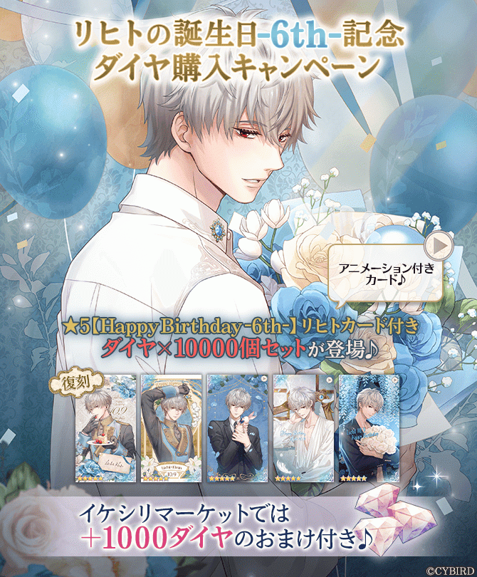 ※イケシリマーケットに期間限定で追加された「ダイヤ×10000個(有償ダイヤ10000個+リヒト★5カード-6th-付)」を購入すると、「【Happy Birthday-6th-】リヒト」をプレゼントボックスにお贈りします。