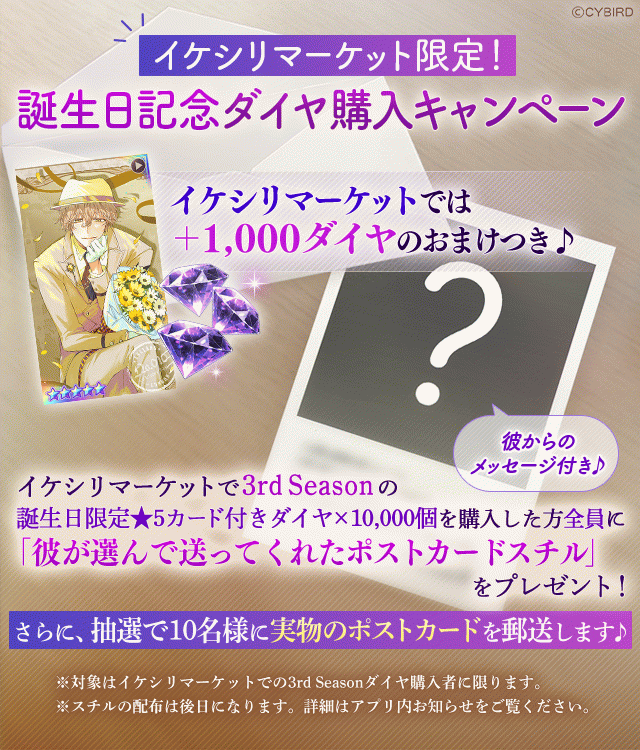 ※イケシリマーケットに期間限定で追加された「ダイヤ×10000個(有償ダイヤ10000個+ダリウス★5カード-3rd-付)」を購入すると、「【Happy Birthday-3rd-】ダリウス」をプレゼントボックスにお贈りします。