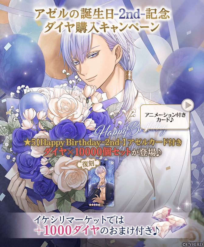 ※イケシリマーケットに期間限定で追加された「ダイヤ×10000個(有償ダイヤ10000個+アゼル★5カード-2nd-付)」を購入すると、「【Happy Birthday-2nd-】アゼル」をプレゼントボックスにお贈りします。