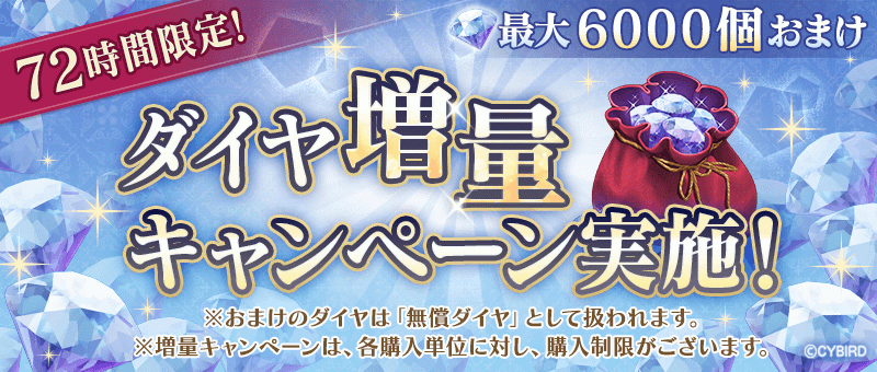 ※「10,000ダイヤ以上の商品を購入する」とは、対象期間内の合計購入額ではございません。対象期間内に「ダイヤ×10000個」以上を購入することで配布対象となります。