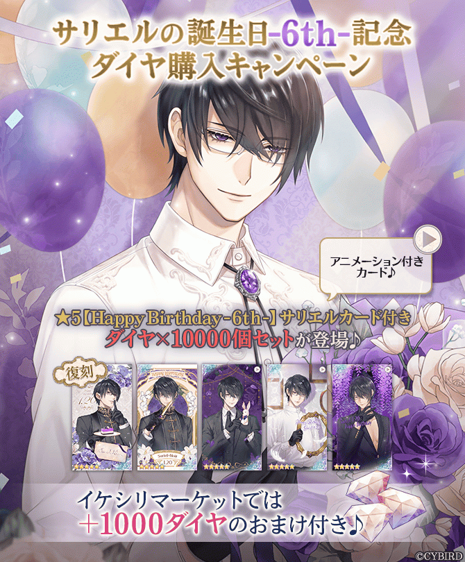※イケシリマーケットに期間限定で追加された「ダイヤ×10000個(有償ダイヤ10000個+サリエル★5カード-6th-付)」を購入すると、「【Happy Birthday-6th-】サリエル」をプレゼントボックスにお贈りします。
