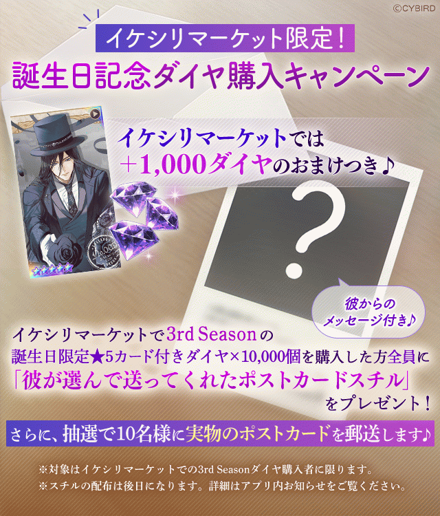 ※イケシリマーケットに期間限定で追加された「ダイヤ×10000個(有償ダイヤ10000個+ヴィクトル★5カード-3rd-付)」を購入すると、「【Happy Birthday-3rd-】ヴィクトル」をプレゼントボックスにお贈りします。