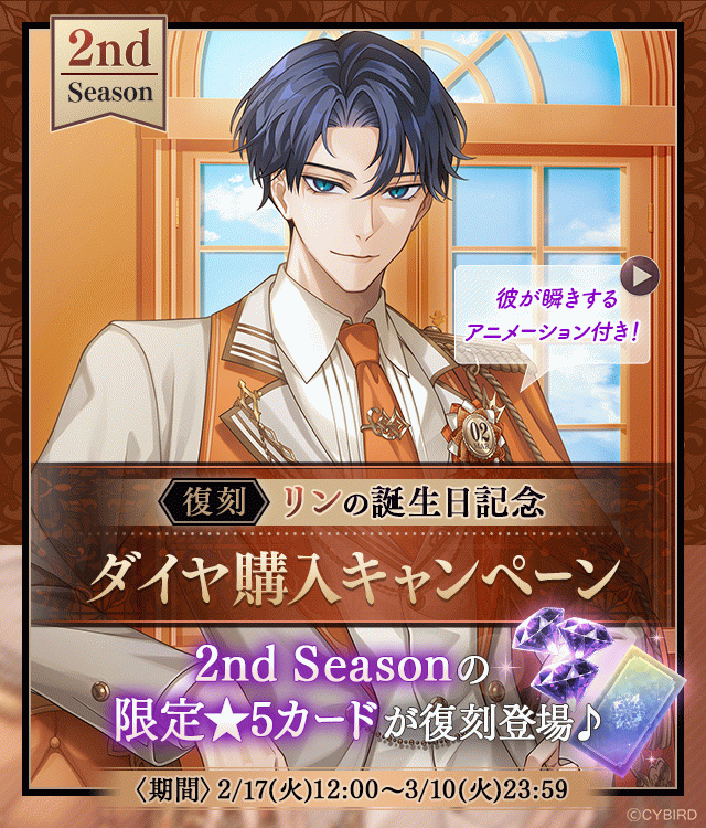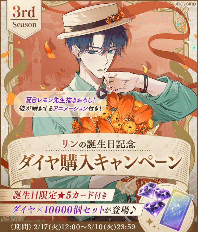 イケメンヴィラン【リン誕生日記念キャンペーン♪】ダイヤ×1000個&ポストカードスチルがおまけで付いてくる!