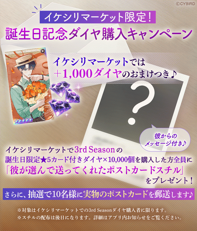 ※イケシリマーケットに期間限定で追加された「ダイヤ×10000個(有償ダイヤ10000個+リン★5カード-3rd-付)」を購入すると、「【Happy Birthday-3rd-】リン」をプレゼントボックスにお贈りします。