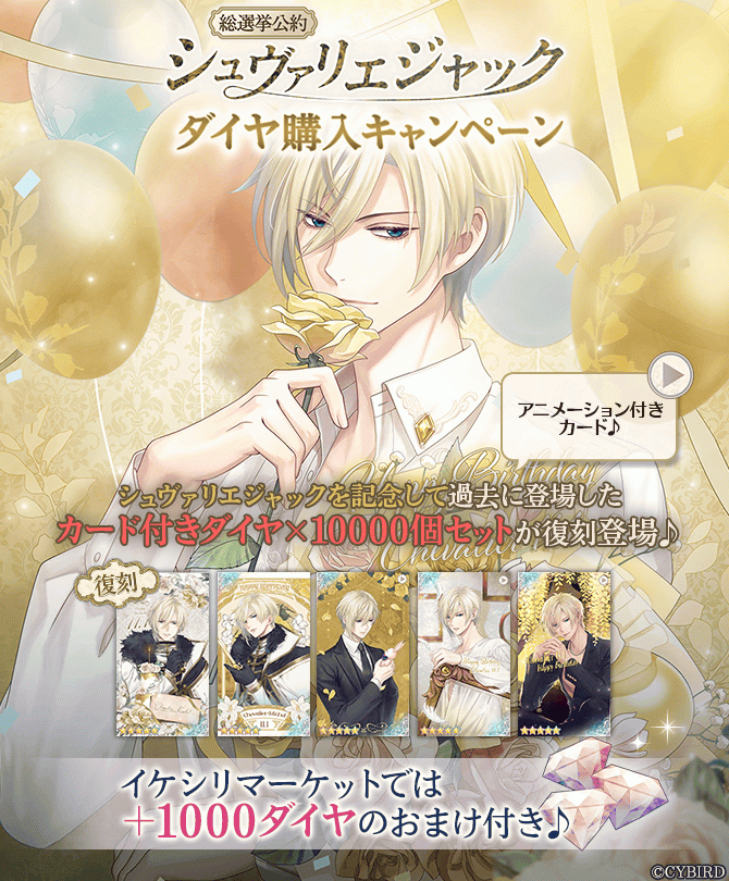 総選挙公約として、シュヴァリエの誕生日限定★5カードが復刻登場!イケシリマーケットでシュヴァリエのカード付きダイヤを購入するとさらに「ダイヤ×1000個」おまけで付いてくる!